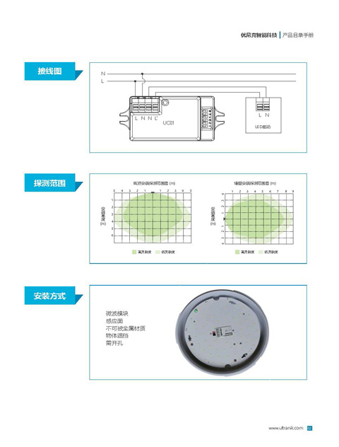 超强性价微波感应开关UC01 技术参数 电压 220 ~ 240VAC 50/60Hz 功率 400W(容性负载) 800W(阻性负载) 静态功耗 <0.5W 探测范围